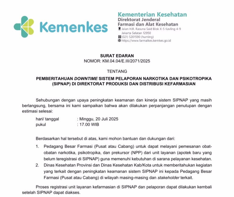 Jakarta, IAINews – Kementerian Kesehatan Republik Indonesia (Kemenkes RI) melalui Direktorat Jenderal Farmasi dan Alat Kesehatan mengumumkan perpanjangan penutupan sementara (downtime) Sistem Pelaporan Narkotika dan Psikotropika (SIPNAP). Penutupan ini dilakukan dalam rangka peningkatan keamanan dan kinerja sistem, yang dijadwalkan selesai pada Minggu, 20 Juli 2025 pukul 17.00 WIB.